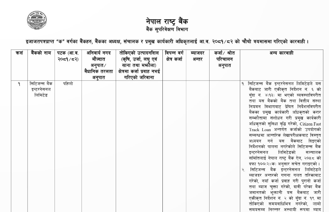 कर्जा नोक्सानी व्यवस्था कायम नगरेको, यस बैंकबाट जारी चालुपुँजी सम्बन्धी मार्गदर्शन, २०७९ मा भएका व्यवस्थाहरूको पूर्णरूपमा पालना नभएको, तोकिएका क्षेत्रमा प्रवाह भएका कर्जाको गलत रिर्पोटिङ्ग गरेकोले सिटिजन्स बैंकका प्रमुख कार्यकारी अधिकृतलाई सचेत गराइएको राष्ट्र बैंकले जनाएको छ।