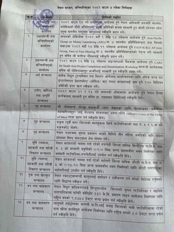 यस्ता छन् मन्त्रि परिषद् बैठकका १३ निर्णय