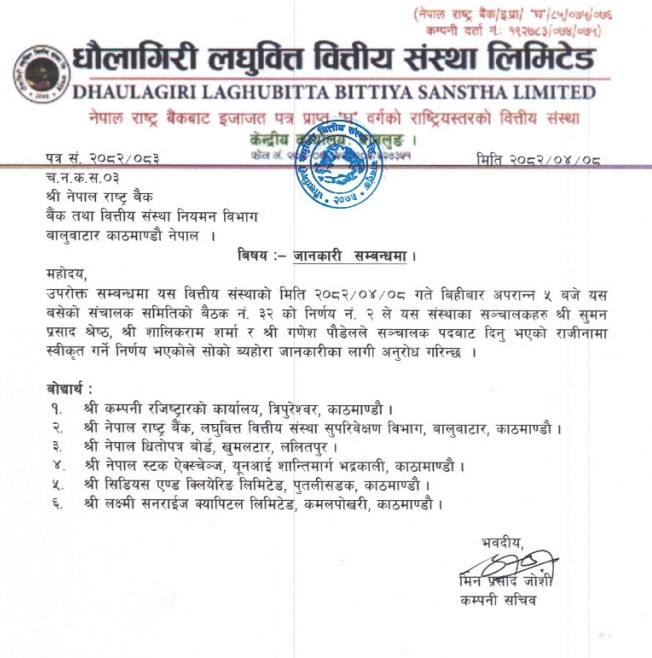 धौलागिरी लघुवित्तका ३ जना सञ्चालकद्वारा एकैपटक राजीनामा