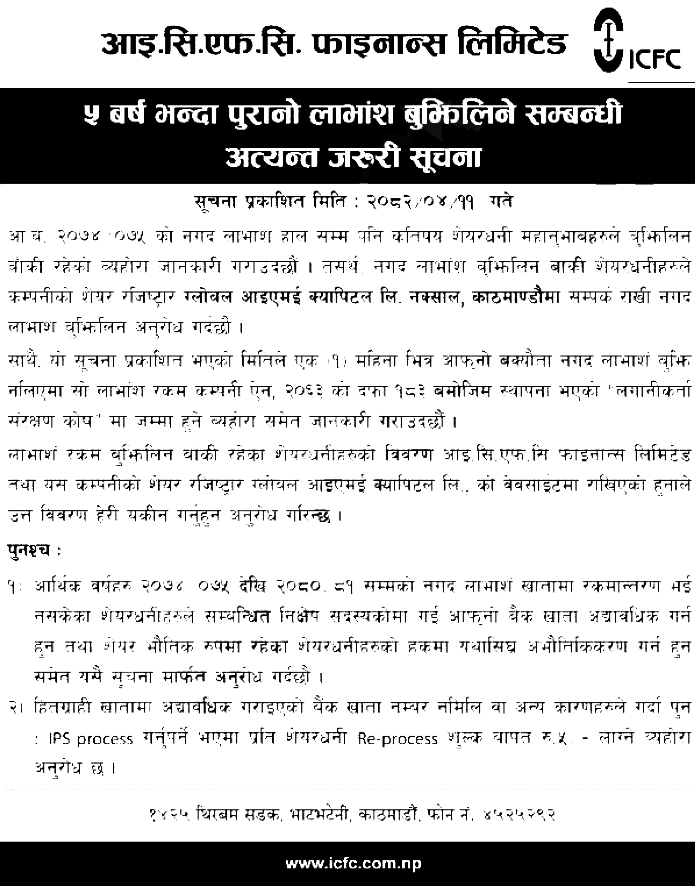 पुरानो लाभांश लिन शेयरधनीलाई आइसिएफसि फाइनान्सको आग्रह