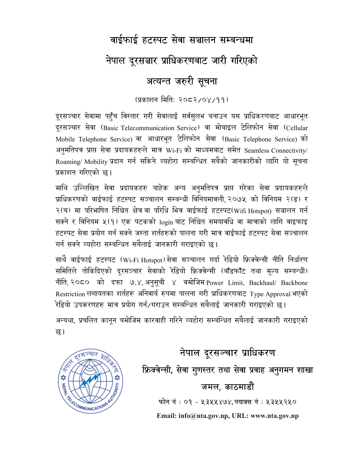 सूचनामार्फत प्राधिकरणले वाई-फाई हटस्पट सेवा सञ्चालन गर्दा रेडियो फ्रिक्वेन्सी नीति निर्धारण समितिबाट तोकिएको ‘रेडियो फ्रिक्वेन्सी (बाँडफाँट तथा मूल्यसम्बन्धी) नीति, २०८०’ अन्तर्गत दफा ७.४ र अनुसूची ४ मा उल्लेख गरिएका शर्तहरूको अनिवार्य पालना गर्न निर्देशन दिएको छ। ती शर्तहरूमा पावर लिमिट, ब्याकहल/ब्याकबोन रेस्ट्रिक्सनजस्ता प्रावधान प्रमुख रूपमा उल्लेख छन्।