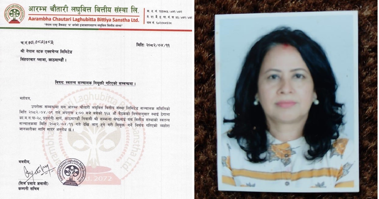 काठमाडौं । आरम्भ चौतारी लघुवित्त वित्तीय संस्था लिमिटेडले अनुभव सम्पन्न बैंकर सम्झना श्रेष्ठलाई स्वतन्त्र संचालक पदमा नियुक्त गरेको छ। संस्थाको १६५ औं सञ्चालक समिति बैठकले श्रेष्ठलाई स्वतन्त्र संचालकमा नियुक्त गर्ने निर्णय गरेको हो।