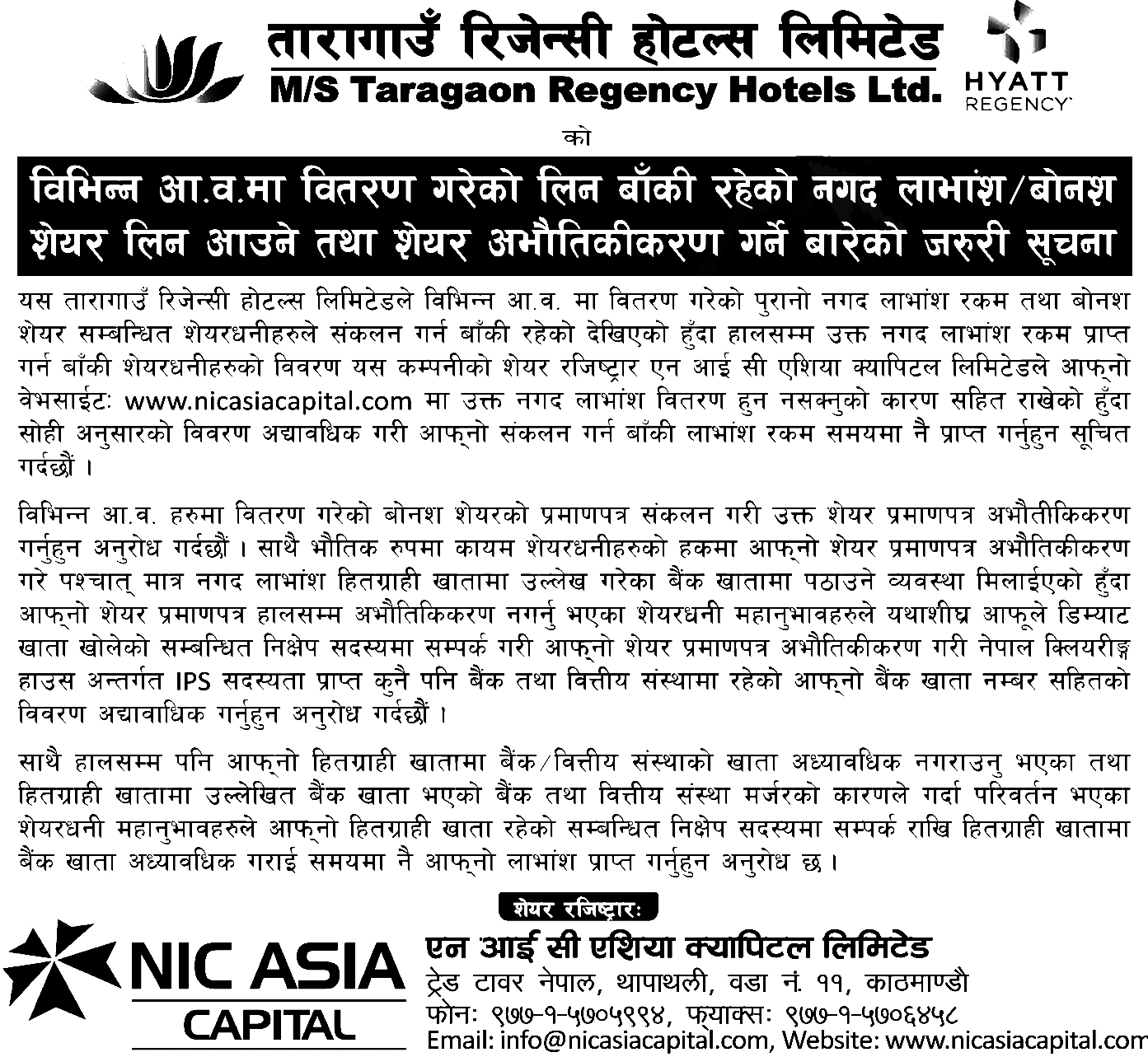काठमाडौं । तारागाउँ रिजेन्सी होटल्स लिमिटेडले विभिन्न आर्थिक वर्षमा वितरण गरेको पुरानो लाभांश लिन बाँकी शेयरधनीलाई आग्रह गरेको छ।