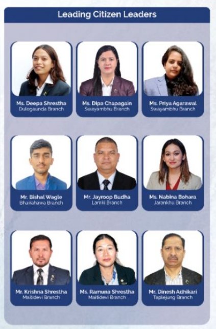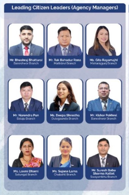 त्यस्तै, कम्पनीको बीमा व्यवसाय वृद्धि गर्नुका साथै हजारौ नागरिकहरुको बीमा गरी जीवन रक्षावरण गर्दै आएकी दुलेगौंडा ब्रान्चकी दिपा श्रेष्ठ, स्वयम्भू ब्रान्चकी दिपा, चापागाई, स्वयम्भू प्रिया अग्रवाल, भैरहवा ब्रान्चका विशाल वाग्ले, लम्की ब्रान्चका जयरुप बुद्ध, मैतिदेवि ब्रान्चका कृष्ण श्रेष्ठ, सोही ब्रान्चकी रमुना श्रेष्ठ र ताप्लेजुङ ब्रान्चका दिनेश अधिकारी लगायतका अभिकर्ताहरु लिडिङ सिटिजन लिडर्स बन्न सफल भएका कम्पनीले जानकारी दिएको छ ।
