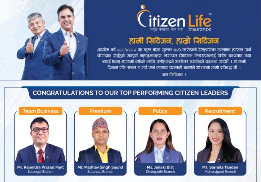 साथै, प्राप्त विवरण अनुसार सिटिजन लाइफमा आर्थिक वर्ष २०८१–८२ मा सर्बोत्कृष्ट बीमा व्यवसाय गर्दै बानेश्वर ब्रान्चका भेसराज भट्टराई, मैतिदेबि शाखाका टुक बहादुर राना, महाराजगंन्जकी गिता रायमाझी, बालाजु ब्रान्चका नरेन्द्र पुन, दुलेगौंडा शाखाकी दिपा श्रेष्ठ, बानेश्वर ब्रान्चका किशोर पोखरेल, सतुङ्गल शाखाकी लक्ष्मी धामी, चाबहिल शाखाकी सुजन लामा र स्वयम्बु शाखाका सुरेश बाबु शर्मा कट्टेल लगायतका एजेन्सी म्यमनेजरहरु लिडिङ सिटिजन लिडर्स (एजेन्सी म्यानेजर्स) बन्न सफल भएका छन् ।