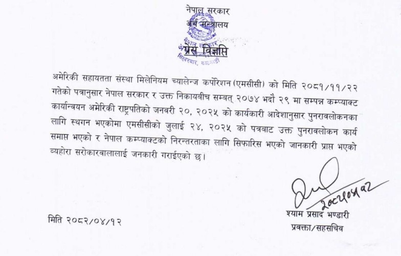 सोमबार अर्थ मन्त्रालयले एक विज्ञप्ति जारी गर्दै जनवरी २०, २०२५ को कार्यकारी आदेशानुसार पुनरावलोकनका लागि स्थगन भएकोमा एमसीसीको जुलाई २४, २०२५ को पत्रबाट उक्त पुनरावलोकन कार्य समाप्त भएको र नेपालको कम्प्याक्टको निरन्तरताका लागि सिफारिस भएको जानकारी प्राप्त भएको जनाएको हो ।