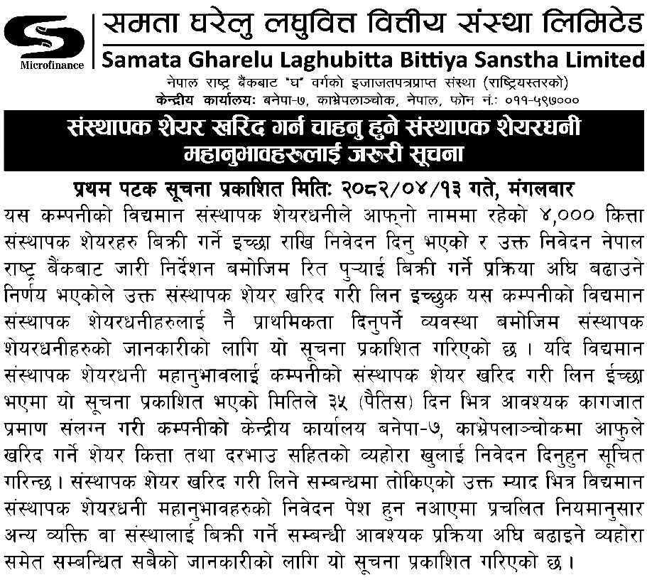 काठमाडौं । समता घरेलु लघुवित्त वित्तीय संस्था लिमिटेडले ४ हजार कित्ता संस्थापक शेयर बिक्रीमा राखेको छ।