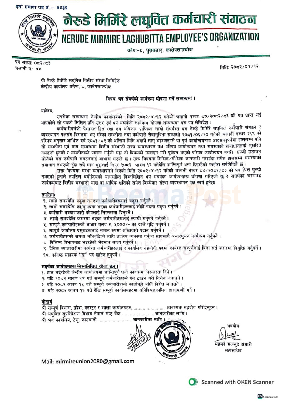 कर्मचारी संगठनले पटक–पटक सम्झौता कार्यान्वयनको लागि विभिन्न तरीकाबाट पहल गरिराख्दा पनि व्यवस्थापन समुहले बेवास्ता गर्दै आएको छ । गत वर्षमा गरिएको सम्झौता शीघ्र कार्यान्वयनको माग गर्दै कर्मचारी संगठनले देशव्यापी आन्दोलनको घोषणा गरेको छ ।