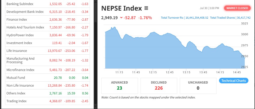 नेपाल स्टक एक्सचेञ्ज (नेप्से) ५२.८७ अकंले घटेरर २९४९ बिन्दुमा कायम भएको छ । आज ३२७ कम्पनीको ३ करोड ६४ लाख १७ हजार कित्ता शेयर किनबेच हुँदा १६ अर्ब ४४ करोड १३ लाख ५४ हजार रुपैयाँको कारोबार भएको हो ।