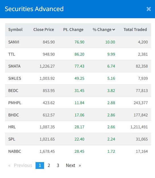 त्यस्तै, समत घरेलु लघुवित्तको ६.७४ प्रतिशत, सिक्लेस हाइड्रोपावरको ५.१६ प्रतिशत, भुगोल इनर्जीको ३.८२ प्रतिशतले शेयरमूल्य बृद्धि भएको छ ।