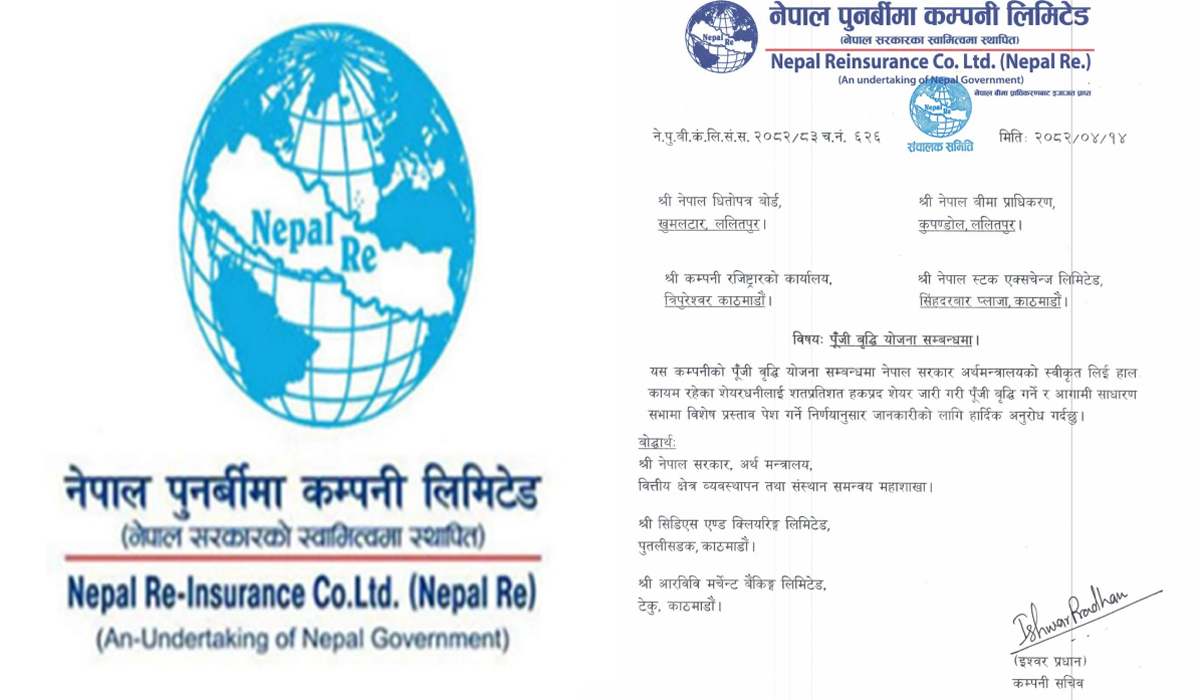 कम्पनीको बुधबार बसेको संचालक समितिको बैठकले यस्तो निर्णय गरेको हो। हाल कम्पनीको चुक्ता पुँजी १३ अर्ब ४२ करोड रहेको छ । नेपाल बीमा प्राधिकरणले पछिल्लो समय कम्पनीलाई तोकिएको चुक्ता पुँजी पुर्याउनको लागि २०८२ माघ मसान्त सम्मको समय दिएको छ ।