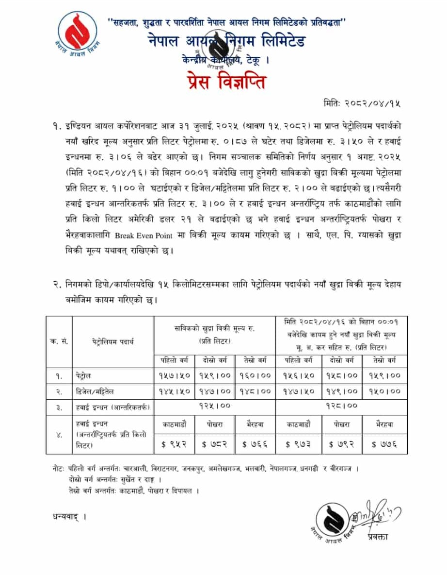 यस अनुसार पेट्रोल १ रुपैयाँले घटेर आएको छ । डिजेल तथा मट्टीतेल २ रुपैयाँले बढेको छ भने आन्तरिक हवाई इन्धन ३ रुपैयाँले बढेको छ ।