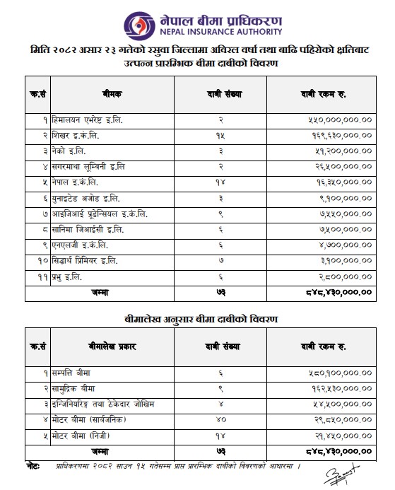 रसुवा बाढीले पुर्‍याएको क्षतिमा करिव ८५ करोडको बीमा दावी, कुन कम्पनीको कति ?