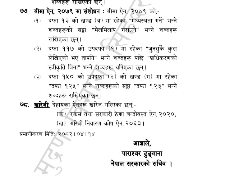 सरकारले बीमा ऐन, २०७९ को दफा १५० को उपदफा (२) को खण्ड (ग) मा रहेका दफा १२५ भन्ने शब्द हटाएर १२३ भन्ने शब्द संसोधन गरेको छ ।