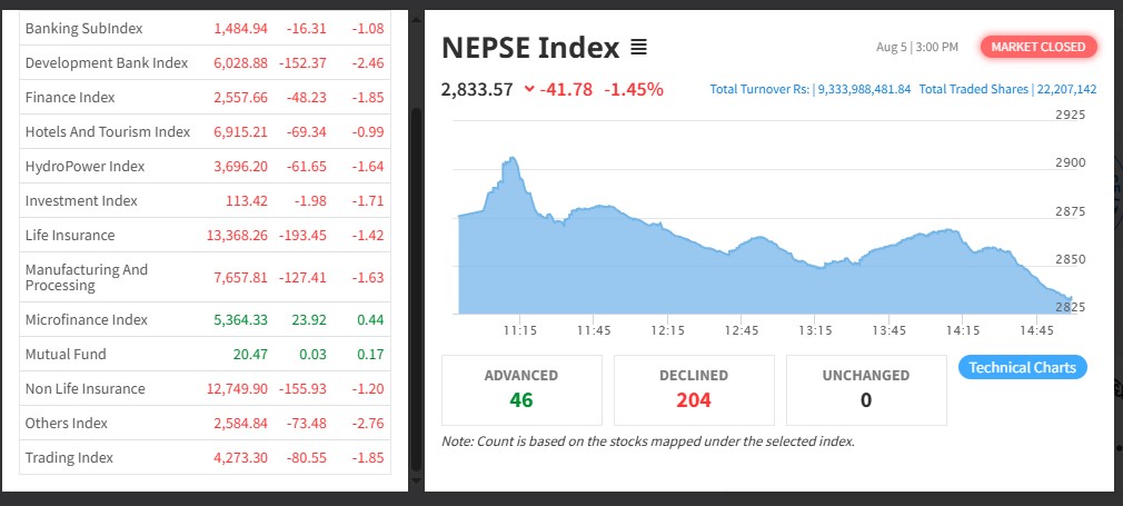 नेपाल स्टक एक्सचेञ्ज (नेप्से) ४१.७८ अकंले घटेर २८३३.५७ बिन्दुमा कायम भएको छ । आज ३२५ कम्पनीको २ करोड २२ लाख ७ हजार कित्ता शेयर किनबेच हुँदा ९ अर्ब ३३ करोड ३९ लाख रुपैयाँको कारोबार भएको हो ।