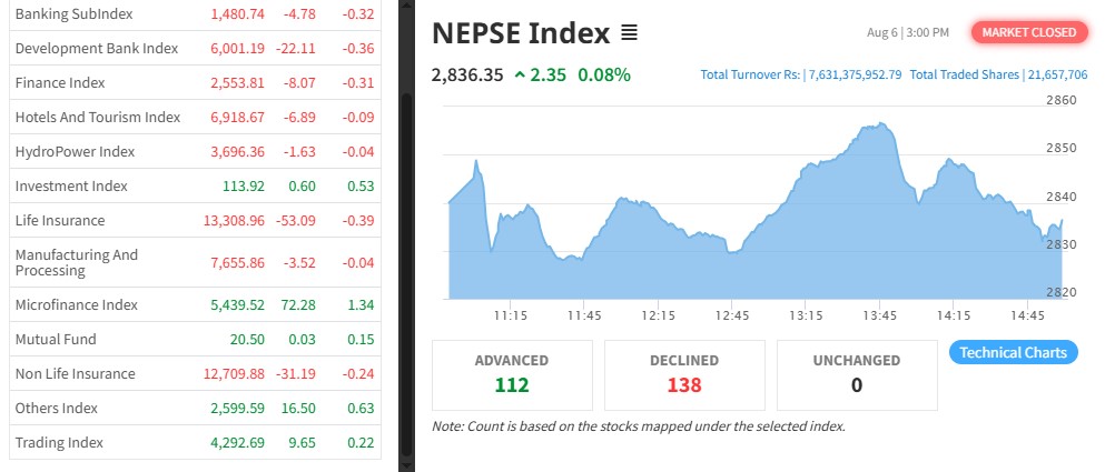नेपाल स्टक एक्सचेञ्ज (नेप्से) २.३५ अकंले बढेर २८३६.३५ बिन्दुमा कायम भएको छ । आज २ करोड १६ लाख ५७ हजार कित्ता शेयर किनबेच हुँदा ७ अर्ब ६३ करोड १३ लाख रुपैयाँको कारोबार भएको हो ।