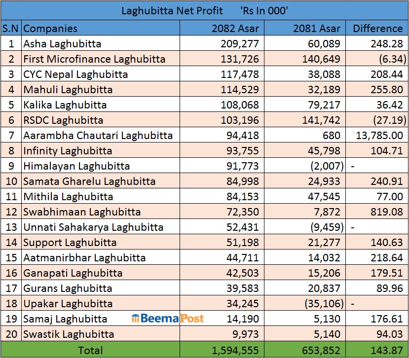 त्यसैगरी दोस्रोमा स्वाभिमान लघुवित्तको ८१९ प्रतिशत तेस्रोमा महुली लघुवित्तको २५५.८० प्रतिशत चौथोमा आशा लघुवित्तको २४८.२८ प्रतिशत र पाँचौंमा समता घरेलु लघुवित्तको २४०.९१ प्रतिशतले खुद नाफा वृद्धि भएको छ।