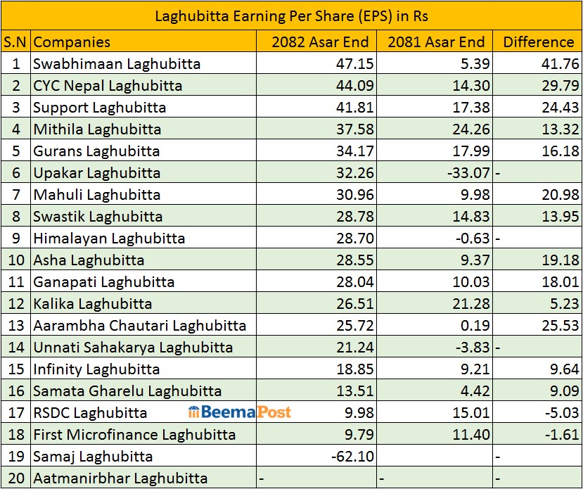 कम्पनीहरूको ईपीएस वृद्धिदरको आधारमा हेर्ने हो भने स्वाभिमान लघुवित्तको सर्वाधिक ४१.७६ रुपैयाँले दोस्रोमा सीवाईसी नेपालको २९.७९ रुपैयाँले तेस्रोमा आरम्भ चौतारी लघुवित्तको २५.५३ रुपैयाँले, चौथोमा सर्पाेट लघुवित्तको २४.४३ रुपैयाँले र पाँचौमा महुली लघुवित्तको २०.९८ रुपैयाँले ईपीएस वृद्धि भएको छ।