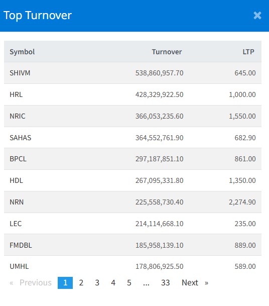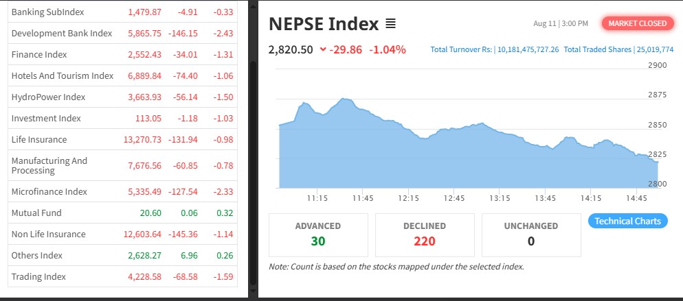 नेपाल स्टक एक्सचेञ्ज (नेप्से) २९.८६ अकंले घटेर २८२०.५० बिन्दुमा कायम भएको छ । आज ३२४ कम्पनीको २ करोड ५० लाख १९ हजार कित्ता शेयर किनबेच हुँदा १० अर्ब १८ करोड १४ लाख रुपैयाँको कारोबार भएको हो ।