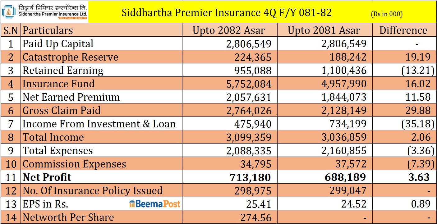 सिद्धार्थ प्रिमियर इन्स्योरेन्सको नाफासँगै आम्दानी बढ्यो, बीमाकोष १६ प्रतिशतले वृद्धि