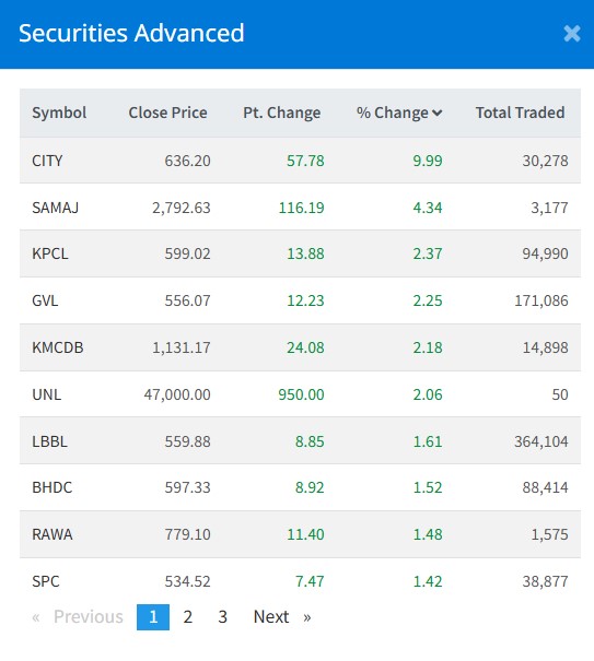 त्यस्तै, समजा लघुवित्तको ४.३४ प्रतिशत, कालिका पावरको २.३७ प्रतिशत, ग्रीन भेन्चर्सको २.२५ प्रतिशत, कालिका लघुवित्तको २.१८ प्रतिशतले शेयरमूल्य बृद्धि भएको छ ।
