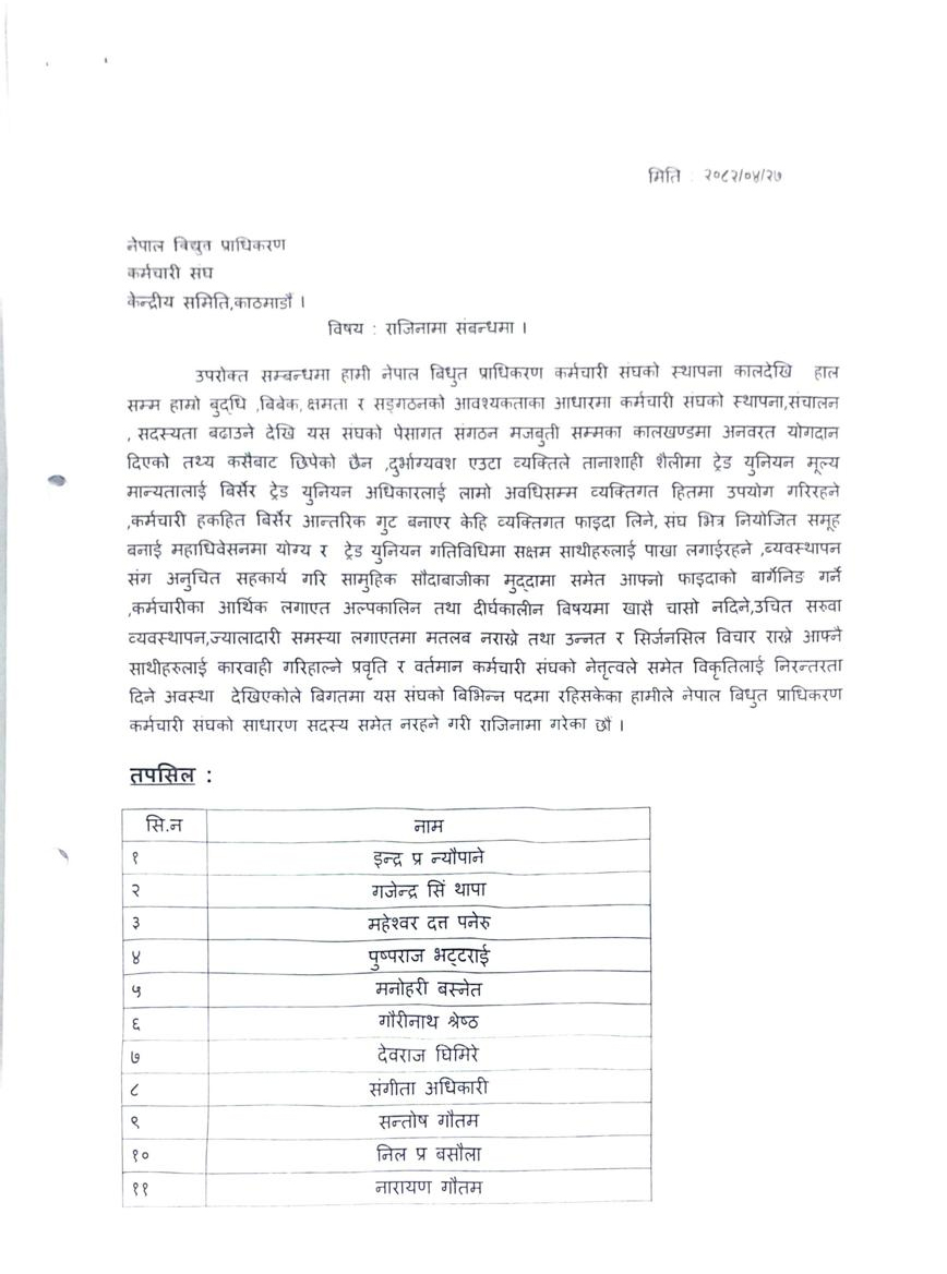 तानाशाही प्रवृत्ति र गुटबन्दीविरुद्ध विद्युत प्राधिकरण कर्मचारी संघका ११ सदस्यको सामूहिक राजीनामा