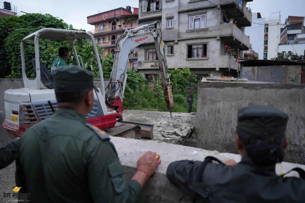 काठमाडौं । कालीमाटी क्षेत्रमा बग्ने खोलामाथी बनेका स्वीकृति बेगरका पक्की पुलसमेत डोजर र ब्रेकर लगाएर काठमाडौं महानगरपालिकाले भत्काएको छ ।