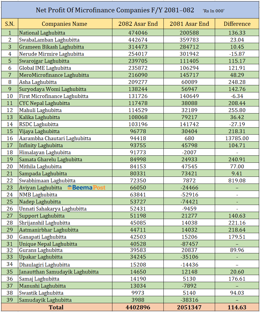 गत आर्थिक वर्षमा वित्तीय विवरण सार्वजनिक गरेका ३९ वटा लघुवित्त संस्थाहरुले कुल चार अर्ब ४० करोड २८ लख रुपैयाँ खुद नाफा आर्जन गर्न सफल भएका छन् । अघिल्लो आवको सोही अवधिको तुलनामा लघुवित्तहरुको मुनाफा ११४ प्रतिशतले बृद्धि भएको छ । अघिल्लो आवको यसै अवधिमा लघुवित्तहरुले दुई अर्ब पाँच करोड १३ लाख रुपैयाँ नाफा आर्जन गरेका थिए ।