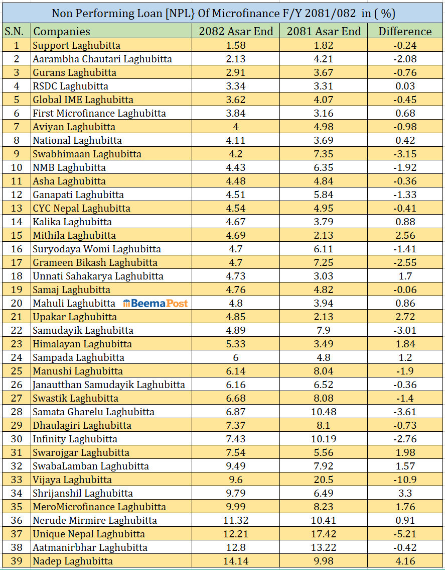 सबैभन्दा बढी नाडेप लघुवित्त, आत्मनिर्भर लघुवित्त, मेरो माइक्रोफाइनान्स लघुवित्त लगायतको खराब कर्जा उत्कृर्षमा पुगेको छ।