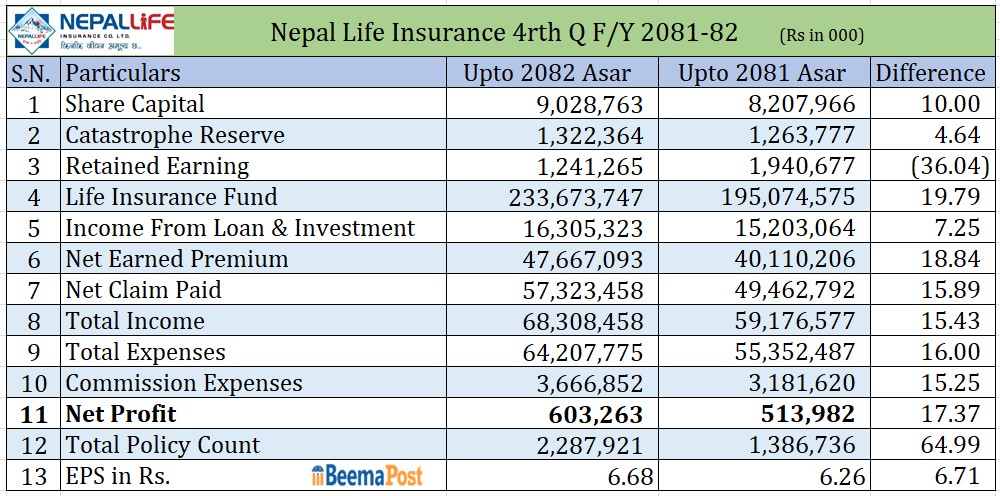 नेपाल लाइफको मुनाफा १७.३७ प्रतिशतले बृद्धि गरी ६० करोड ३२ लाख पुर्याउन सफल भएको छ । अघिल्लो आवमा यस्तो मुनाफा ५१ करोड ३९ लाख रुपैयाँ रहेको थियो । यससँगै कम्पनीको प्रतिशेयर आम्दानी समेत ६ रुपैयाँबाट बृद्धि भई ६.६८ रुपैयाँ पुगेको छ ।