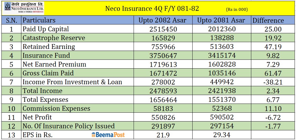 नेको इन्स्योरेन्सको बीमा कोष ९.८२ प्रतिशतले बृद्धि भएर तीन अर्ब ७५ कराड ६ लाख रुपैयाँ सञ्चिती रहेको छ । साथै, कम्पनीले गत वर्ष एक अर्ब ७१ करोड ९६ लाख रुपैयाँ खुद बीमा शुल्क आर्जन गरेको छ । अघिल्लो आवको तुलनामा कम्पनीको बीमा शुल्क आर्जन ७ प्रतिशतले बृद्धि भएको छ ।