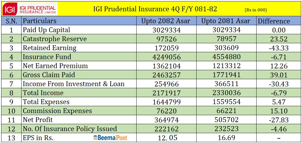 आइजिआई प्रुडेन्सियल इन्स्योरेन्सको बीमा कोष सामान्य अंकले घटेर चार अर्ब २४ कराड ९० लाख रुपैयाँ सञ्चिती रहेको छ । साथै, कम्पनीले गत वर्ष एक अर्ब ३६ करोड २१ लाख रुपैयाँ खुद बीमा शुल्क आर्जन गरेको छ । अघिल्लो आवको तुलनामा कम्पनीको बीमा शुल्क आर्जन १२.२६ प्रतिशतले बृद्धि भएको छ ।