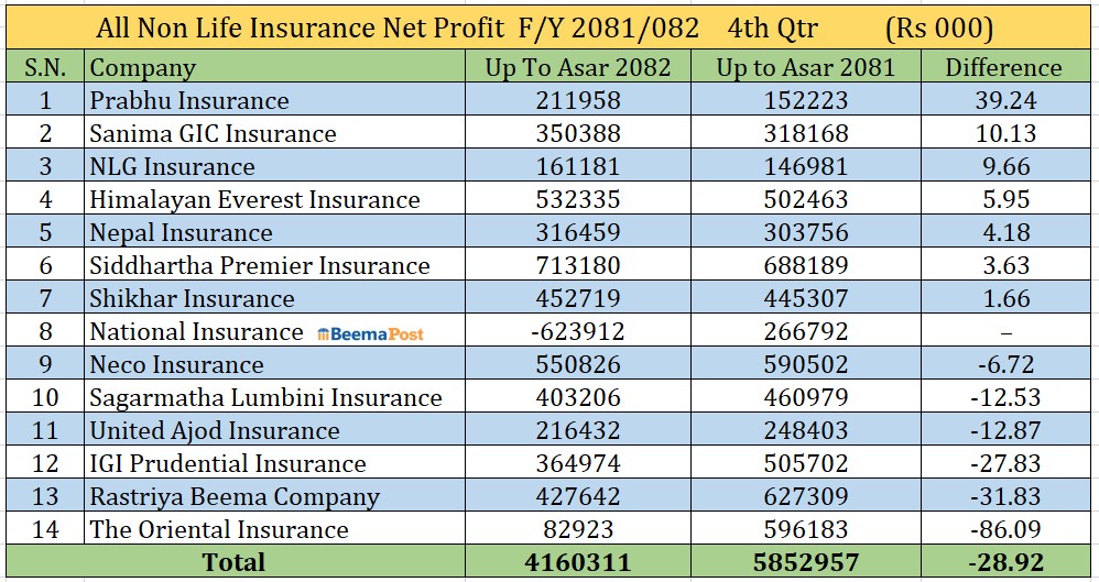 प्रभु इन्स्योरेन्सले २१ करोड १९ लाख रुपैयाँ, एनएलजी इन्स्योरेन्सले १६ करोड ११ लाख रुपैयाँ र द ओरियन्टल इन्स्योरेन्सले आठ करोड २९ लाख रुपैयाँ मुनाफा आर्जन गरेका छन् । साथै, नेशनल इन्स्योरेन्सको वित्तीय अवस्था दयनीय बन्दै गएको छ । गत आवमा कम्पनीको मुनाफा ६२ करोड ३९ लाख ऋणात्मक रहेको छ ।