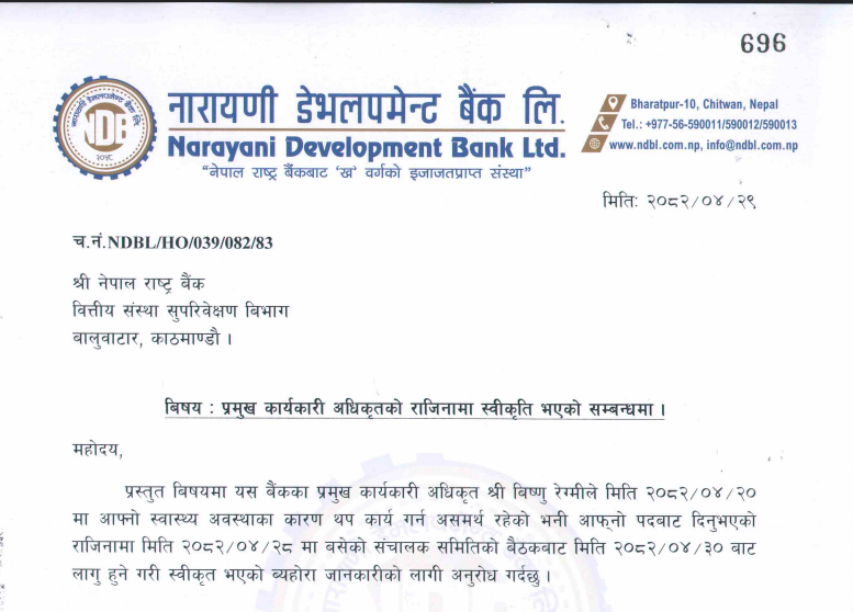 बैंकका सिईओ रेग्मीले आफ्नो स्वास्थ्य अवस्थाका कारण थप कार्य गर्न असमर्थ रहेको भनी आफ्नो पदबाट दिनुभएको राजिनामा स्वीकृत भएको हो ।