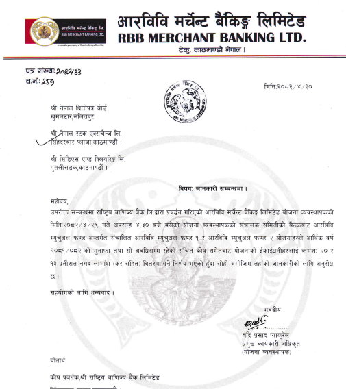 काठमाडौं । राष्ट्रिय बाणिज्य बैंक लि.द्वारा प्रबद्र्धन गरिएको आरविवि मर्चेन्ट बैंकिङ्ग लिमिटेड योजना व्यवस्थापकको हिजोे अपरान्ह ४.३० बजे बसेको योजना व्यवस्थापकको संचालक समितीको बैठकबाट आरविवि म्युचुअल फण्ड अन्तर्गत संचालित आरविवि म्युचुअल फण्ड १ र आरविवि म्युचुअल फण्ड २ योजनाहरुले इकाइधनीलाई प्रतिफल दिने निर्णय गरेको छ ।