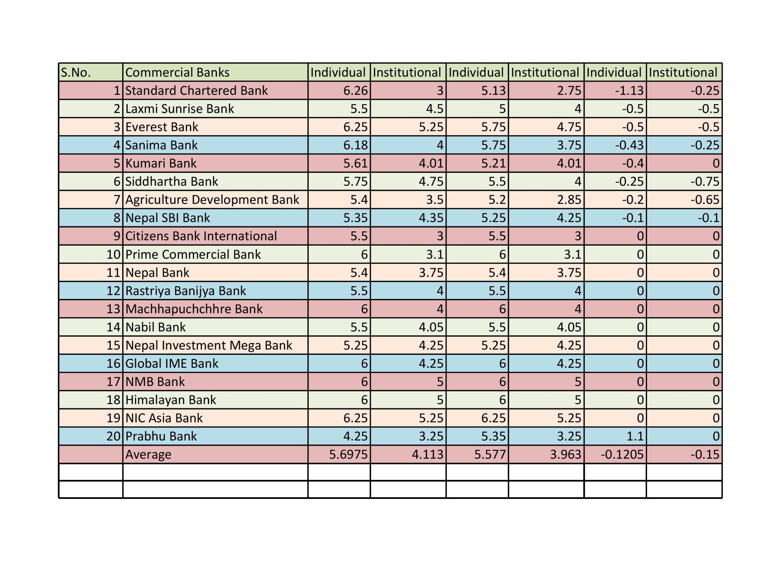 संस्थागत मुद्दति निक्षेपमा भने ७ वाणिज्य बैंकहरुले अधिकतम ब्याजदर घटाएका छन् भने कुनै पनि बैंकले ब्याजदर बढाएका छैनन्। यस्तो मुद्दति निक्षेपको ब्याजदर औषतमा ०।१५ प्रतिशतविन्दु घटेको हो।