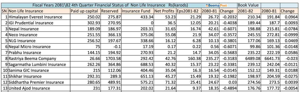 निर्जीवन बीमा कम्पनीमा सुचीकृत १३ वटा कम्पनीमध्ये सानिमा जीआईसी इन्स्योरेन्स र सिद्धार्थ प्रिमियर इन्स्योरेन्सको मात्रै खुद मुनाफा गत वर्ष भन्दा बढैको देखिएको छ भने बाँकी ११ वटै कम्पनीको खुद मुनाफामा भारी गिरावट देखिएको छ ।