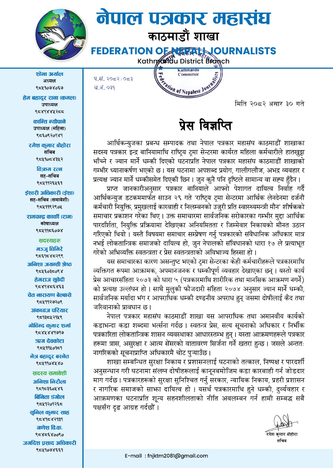 काठमाडौं शाखाका सचिव रमेश कुमार बोहोराले पत्रकारमाथि भएको आपराधिक तथा अमानवीय आक्रमणको घोर भर्त्सना गर्दै सम्बन्धित सुरक्षा निकाय र प्रशासनलाई तत्काल, निष्पक्ष र पारदर्शी अनुसन्धान गरी दोषीलाई कानूनबमोजिम कडाभन्दा कडा कारबाही गर्न जोडदार माग गरेको छ ।