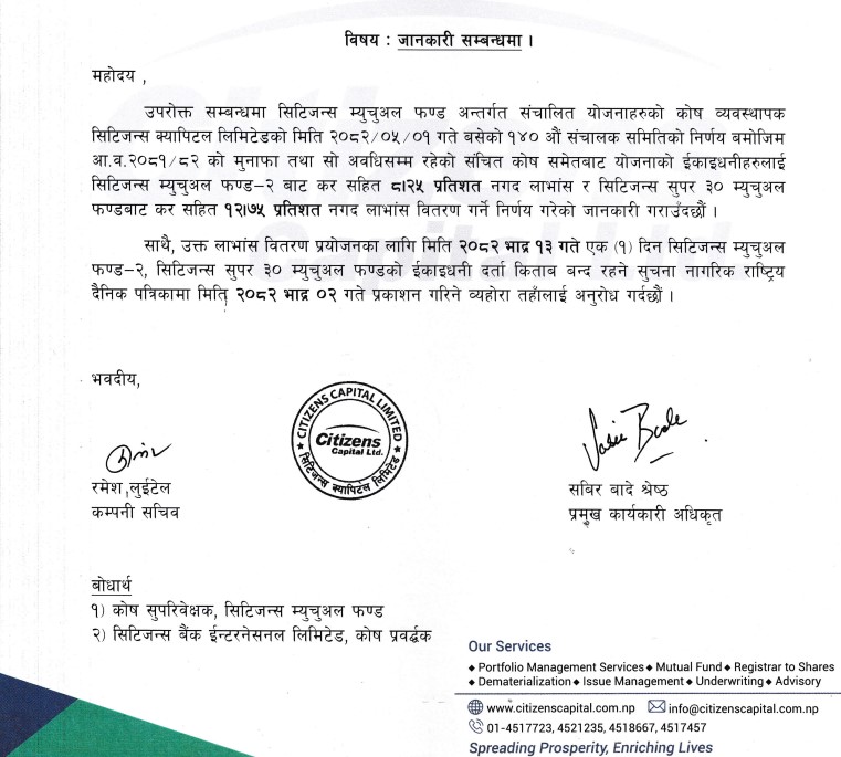 जसमध्ये सिटिजन्स म्युचुअल फन्ड २ का इकाइधनीहरुलाई गत वर्षको नाफाबाट करसहित ८.२५ प्रतिशत र सिटिजन्स सुपर ३० का इकाइधनीहरुलाई करसहित १२.७५ प्रतिशत नगद लाभांश वितरण गर्ने घोषणा गरेको हो।