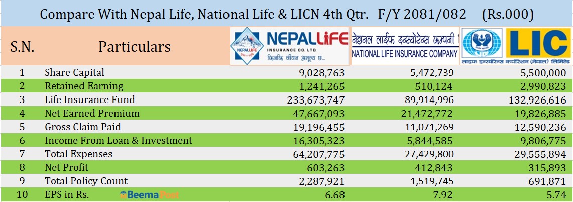 नेपाली बीमा क्षेत्रमा यी कम्पनीहरु ठूला र वित्तीय विवरणमा बलिया रहेका छन् । जहाँ हजारौं मानिसहरुले जीवन बीमा गरेर आफ्नो जीवन रक्षावरणको जिम्मा लगाएका छन् । नागरिकहरुले नयाँ, कमजोर भन्दा पनि वित्तीय विवरणले बलिया र पुराना ठूला विश्वासिला कम्पनीहरुलाई बीमा गर्नको लागि बढी रुचाउने गर्दछन् । नेपाल लाइफ इन्स्योरेन्स, एलआइसी नेपाल र नेशनल लाइफ इन्स्योरेन्सलाई बीमापोष्टले वित्तिय विवरणमा आधारित रहेर दाँजेर हेर्दा यस्तो चित्र कोरिएको छ ।