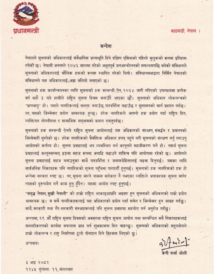 शुभकामना सन्देशमार्फत प्रधानमन्त्री ओलीले राष्ट्रिय सूचना आयोग तथा सरोकार भएका सबै निकायलाई सशक्तीकरणको कार्यमा सफलता प्राप्त गर्न शुभेच्छा व्यक्त गर्दै सूचनाको अधिकारको सदुपयोगले लोकतन्त्र र राष्ट्र निर्माणमा ठूलो योगदान दिने विश्वास व्यक्त गरेका छन् ।