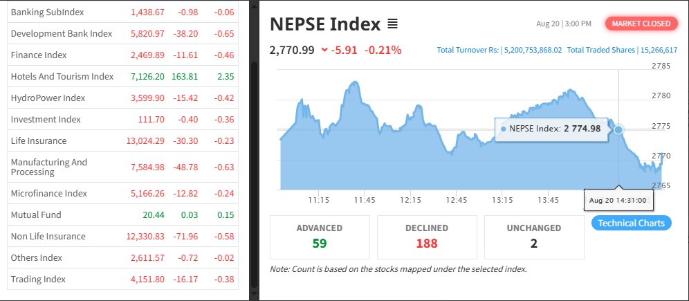 नेपाल स्टक एक्सचेञ्ज (नेप्से) ५.९१ अकंले घटेर २७७०.९९ बिन्दुमा कायम भएको छ । आज ३२३ कम्पनीको १ करोड ५२ लाख ६६ हजार कित्ता शेयर किनबेच हुँदा ५ अर्ब २० करोड ७ लाख ५३ हजार रुपैयाँको कारोबार भएको हो ।