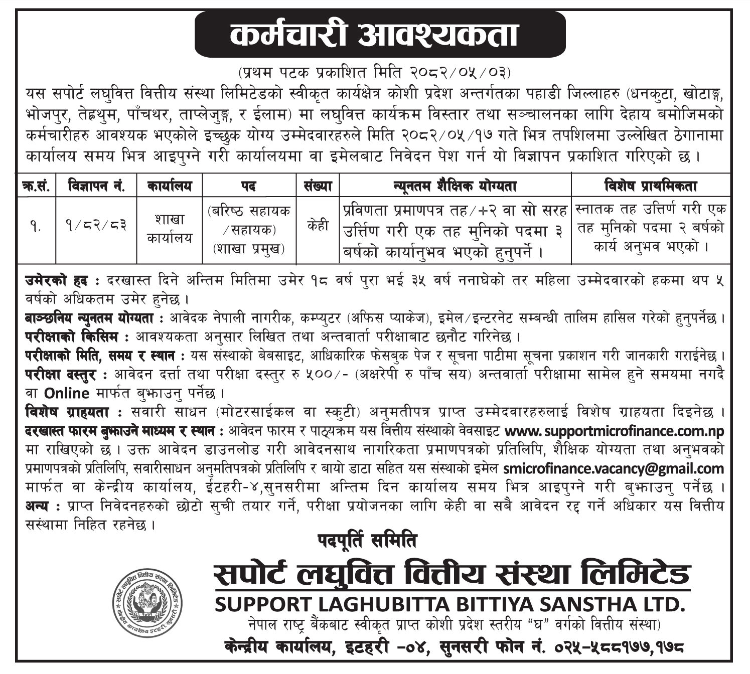 सपोर्ट लघुवित्तद्वारा कर्मचारी माग, कति चाहिन्छ शैक्षिक योग्यता ?