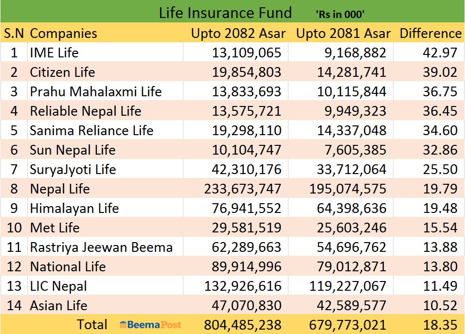 अघिल्लो वर्ष ९ अर्ब १६ करोड रुपैयाँ बीमाकोष रहेको यस कम्पनीले गत वर्ष ४२.९७ प्रतिशत वृद्धि गर्दै १३ अर्ब १० करोड रुपैयाँको बीमाकोष खडा गर्न सफल भएको छ। त्यसैगरी सिटिजनको ३९.०२ प्रतिशत, प्रभु महालक्ष्मीको ३६.७५ प्रतिशत, रिलायबल नेपालको ३६.४५ प्रतिशत, सानिमा रिलायन्सको ३४.४० प्रतिशत, सन नेपालको ३२.८६ प्रतिशत र सूर्यज्योतिको २५.५० प्रतिशतले जीवन बीमाकोष बढेको छ।