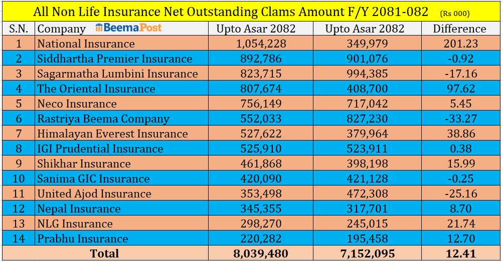 निर्जीवन बीमकहरुको खुद बीमा दावी बक्यौता १२%ले बढेर ८ अर्ब पुग्यो, नेशनल इन्स्योरेन्सको सबैभन्दा बढी (तथ्यांकसहित)