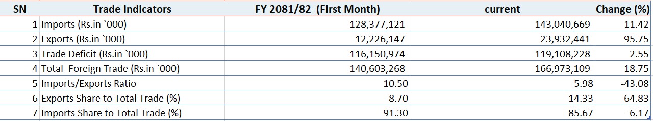 त्यसैगरी, निर्यातमा उल्लेख्य वृद्धि देखिएको छ। चालु वर्षको पहिलो महिनामा निर्यात २३ अर्ब ९३ करोड रुपैयाँ पुगेको छ जसले ९५.७५ प्रतिशतको वृद्धि दर देखाएको छ।