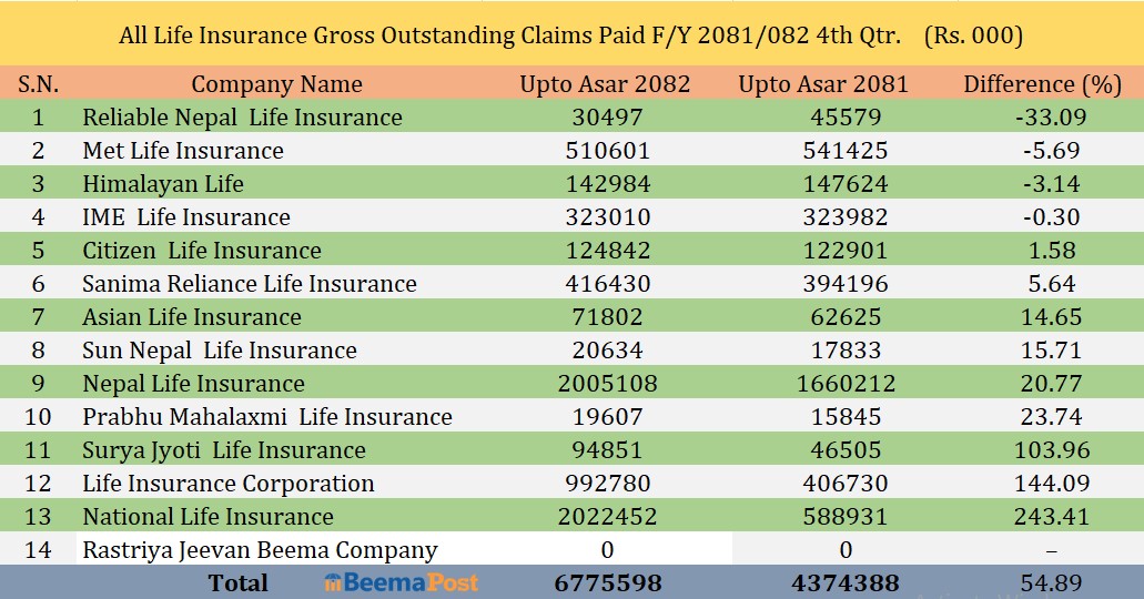 जीवन बीमा कम्पनीहरुको बीमा दावी बक्यौता ६ अर्ब ७७ करोड, प्रभु महालक्ष्मी र सन नेपालको सबैभन्दा कम