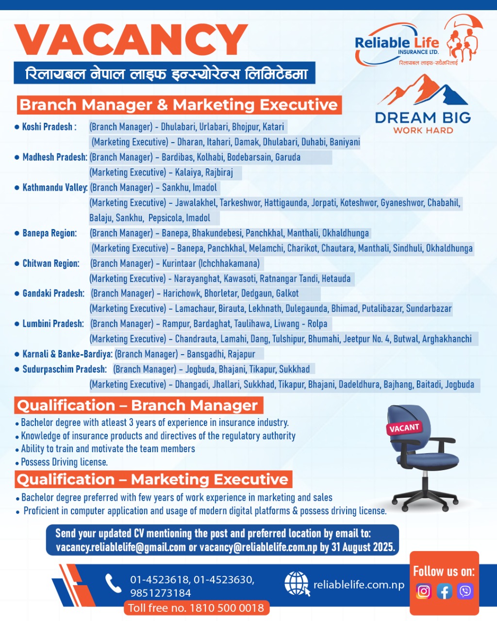 कम्पनीले देशका विभिन्न स्थानमा रहेका ब्रान्चहरुमा ब्रान्च म्यानेजर र मार्केटिङ एक्सक्युटिभ पदमा योग्य कर्मचारी माग गरेको छ । कम्पनीका अनुसार ब्रान्च म्यानेजर पदमा आवेदन दिनको लागि स्नातक तह उत्तिर्ण गरेको र बीमा क्षेत्रमा तीन वर्ष काम गरेको अनुभव चाहिने छ ।