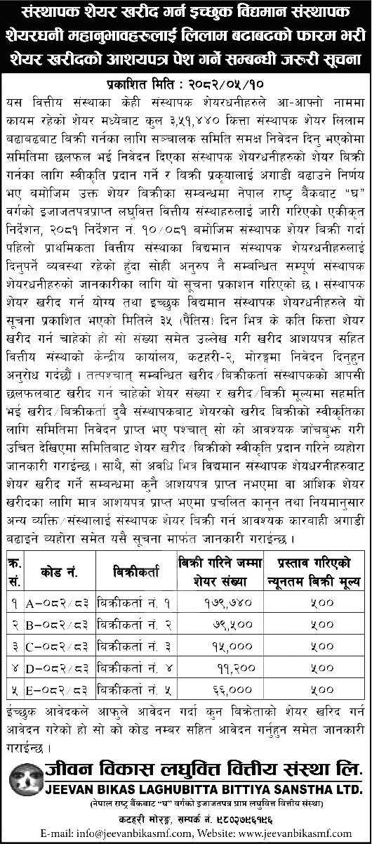 काठमाडौं । जीवन विकास लघुवित्त वित्तीय संस्था लिमिटेडले आफ्ना केही संस्थापक शेयरधनीहरूको स्वामित्वमा रहेको ३ लाख ५१ हजार ४४० कित्ता संस्थापक शेयर लिलाम बढाबढ मार्फत् बिक्रीमा राखेको छ।