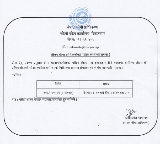 नेपाल बीमा प्राधिकरण कोशी प्रदेशले अभिकर्ता परीक्षा सञ्चालन गर्ने